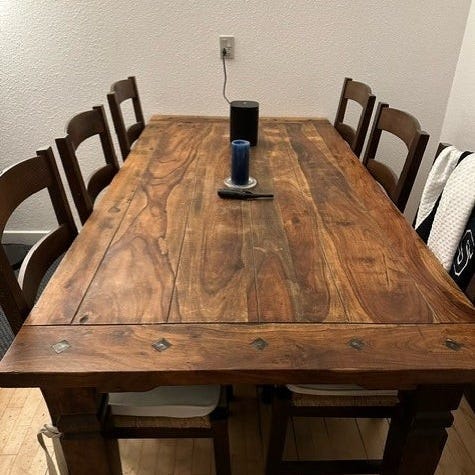 Solidt spisebord med 2 tillægsplader og 6 stole.