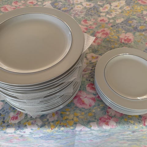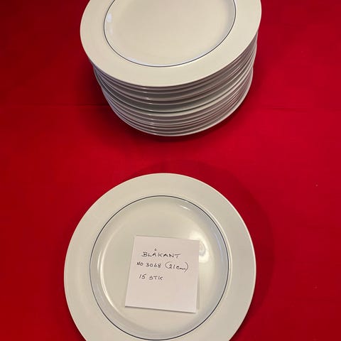 Tallerkenerne er hvide med en enkel kantdekoration. Velegnede til både hverdag og festlige lejligheder.