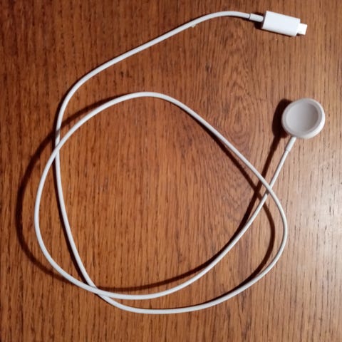 Apple oplader til Apple Watch plus en lille stander med non-slip silikone under bunden