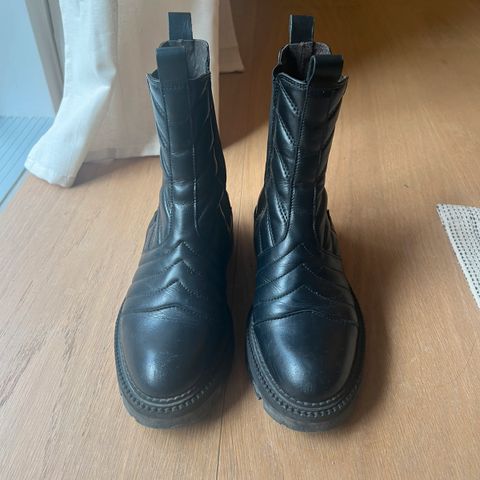 Sorte Billi bi støvler .. i læder med lynlås i hæl med knap .. støvlen er i Coco præget skind . Og i str 38 . Lidt brugt men som nye .. jeg kan sende varen