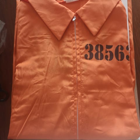 Boland fangekostume til mænd i orange farve. Kostumet består af en heldragt med lynlås foran og er dekoreret med tryk, der angiver '40886' og 'County Jail'.