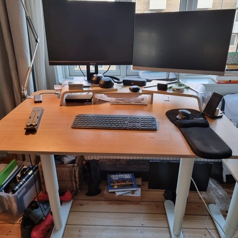 2 hæve sænkeborde sælges. Elektrisk betjening af højde. Kan justeres op til en højde der passer folk over 2 meter.