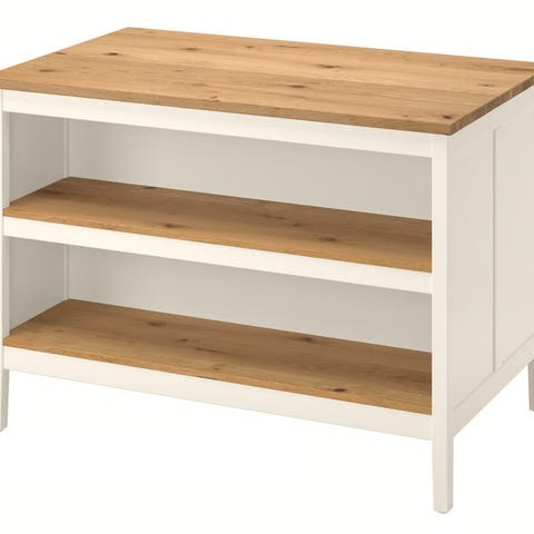 Stenstorp Køkkenø fra IKEA. Er benyttet i showroom så står stort set som ny. Bordplade i massivt træ og 2 hylder i metal. Står samlet og skal afhentes i Augustenborg. H: 90, L: 126, D: 79.
