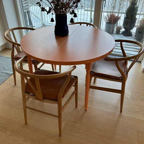 Smukt spisebordssæt i klassisk fransk/gustaviansk stil, bestående af rundt/ovalt bord og tilhørende stole.
