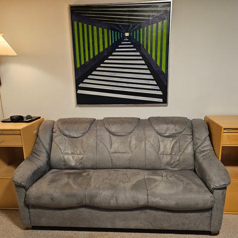2 personers fungerer fint. Men der er slidskade i siddebunden og det ene armlæn udvendig mål 164 cm