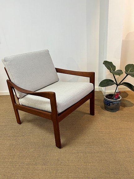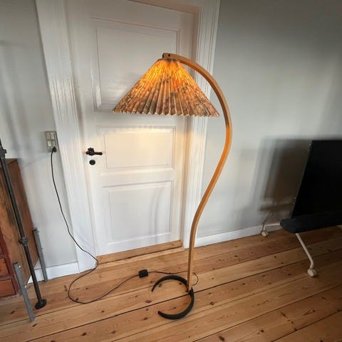 Caprani gulvstanderlampen i formbøjet Bøg med støbejernsfod, Et ikonisk stykke dansk design, kendt for sin elegante, buede træstander og den karakteristiske halvmåneformede fod i støbejern. Lampens organiske linjer giver et let og skulpturelt udtryk, som gør den til et unikt blikfang i både moderne og klassiske hjem.