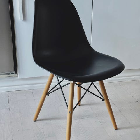 Sælger 8 ens spisebordstole i hvid med træben og sort krydsstel i klassisk, tidløst design inspireret af Charles & Ray Eames.