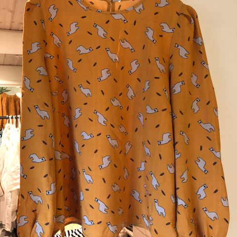 Meget stræk i stoffet. Blusen er multifarvet / leopard print med "guld" tråd og lavet af polyester.