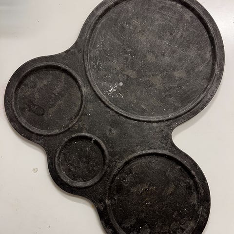 Dekorativ bakke i let materiale (plast/resin) med råt, industrielt udtryk.