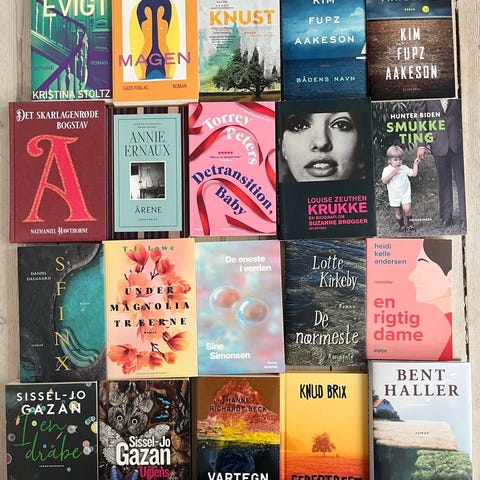 Blandet udvalg af bøger. Indeholder titler af forskellige forfattere, Bjarne Reuter, Kim Leine, Erling Jepsen, Kelvin Lindemann, Majbritte Ulrikkeholm, Suzanne Brøgger, Lisbeth Lundquist og Jane Aamund.