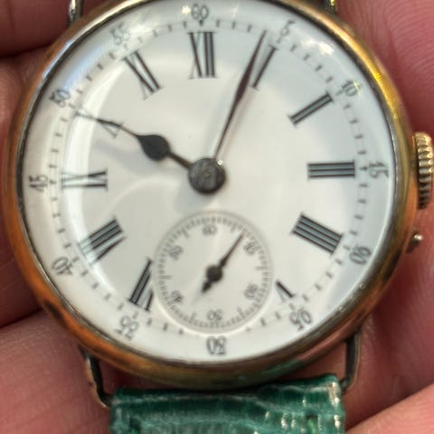 Schweizisk mekanisk ur som har nummer 465 114, foran på urskiven står der: Delbana, 17 Jewels,