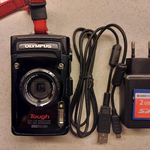Olympus Tough digitalkamera i sort farve. Kameraet er designet til at være robust og egnet til udendørs brug. Leveres med opladerkabel.