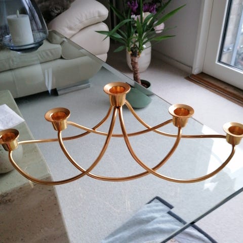Lysestage til bloklys, designer Sanne Traberg for Georg Jensen, rustfrit stål belagt med 18 karat guld. Incl. original æske. Pris: 250,-kr.