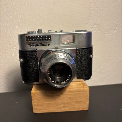Ilford Sportman Auto kamera i metal med brun læderetui. Kameraet er et vintage model lavet i Vesttyskland og har en manuel optik med lukkerfunktion. Kommer med et brunt bæreetui i læder med rem.