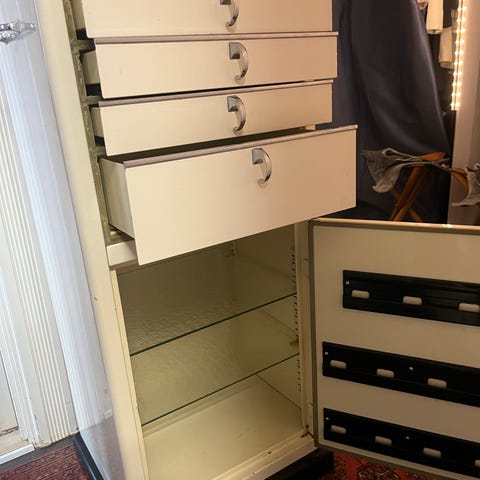 Gammel tandlæge skuffer på hjul. 94 cm udslået. Har stået på tandlæge klinik indtil renovering. Nye hjul. Ruller godt. 6 skuffer. “Øverste håndtag” er ikke en skuffe.