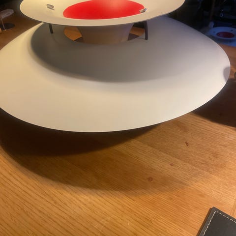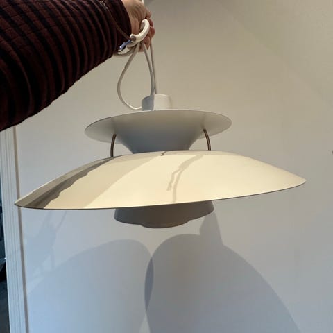 Louis Poulsen PH lampe designet af Poul Henningsen. Lampen har en karakteristisk skærmopbygning med flere lag og er udført i hvidt materiale med detaljer i rosa. Den er velegnet til ophæng og belysning i boligmiljøer.