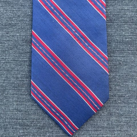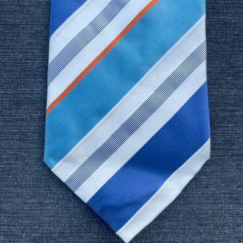 Saddler slips til mand lavet af ren silke. Slipsen har et mønster med små gule figurer på en blå baggrund.