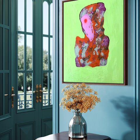 Abstrakt maleri på lærred med dominerende pink og lilla farver. Maleriet har en rektangulær form og er indrammet. Det kan anvendes som vægdekoration i forskellige rum for at tilføje farve og kunstnerisk udtryk.