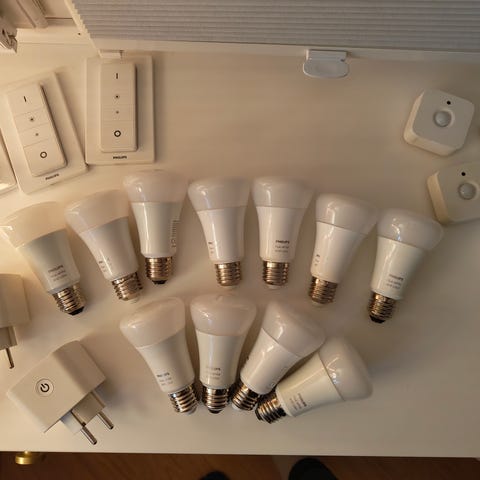 Jeg sælger et sæt Philips Hue Lily spotlys til udendørs brug (3-pak) samt en Philips Hue Smart Plug (fjernbetjent strømafbryder).