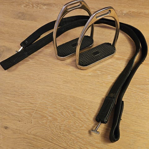 Par af vintage metal stigbøjler med dekorative farvede emaljemotiver. Stigbøjlerne har en rund bund med en bred, buet overdel med plads til fastgørelse. Farverne på emaljedekorationerne inkluderer blå, rød og sort. Egnet til brug med ridestøvler og sadeludstyr.