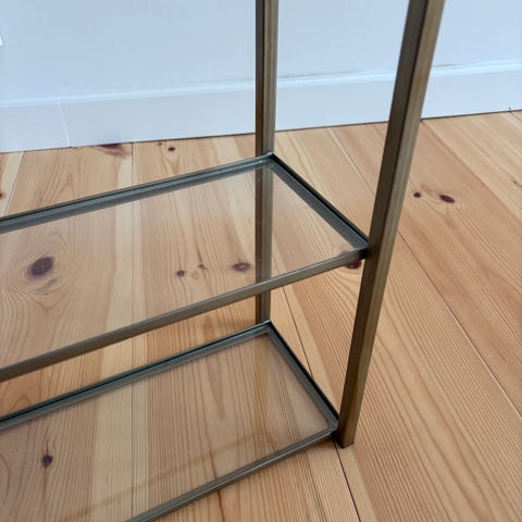 Fin lille reol i glas og messing - man er velkommen til at komme forbi vores butik inden vi flytter d. 1 februar og se den