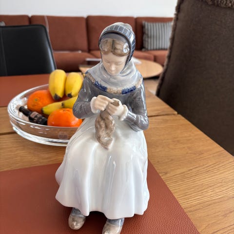 Royal Copenhagen figur af en pige med en kat, lavet i porcelæn. Figuren er detaljeret med malede mønstre og har et klassisk design. Den kan anvendes som dekorativt element i hjemmet.