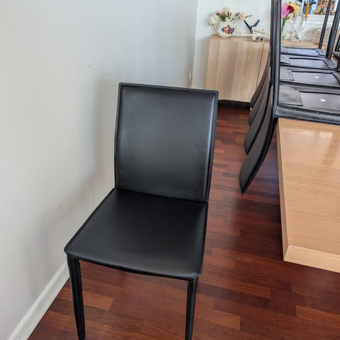 4 stole i rigtig fin stand med kun meget få og små brugsmærker. De er et par år gamle og har været passet godt på. Komforten er i top – man sidder virkelig godt i dem, både til hverdagsbrug og længere middage.