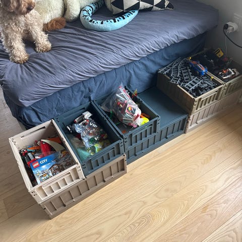 Leander børneindretningsbeholdere i forskellige farver, designet til opbevaring og organisering i børneværelset. Beholderne er lavet af holdbart materiale og findes i flere farvenuancer.