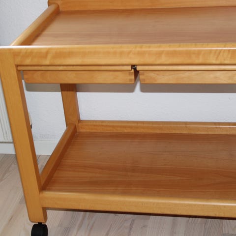 Lille flot bakkebord med en flot dyb glød i træet, ingen skader i træ, trænger til lidt olie, med aftagelig bakke. Meget lig Jens Harald Quistgaard retro.