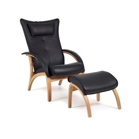 Næsten helt nye lænestole i skind. Trinløs regulering. En fodskammel inklusiv.