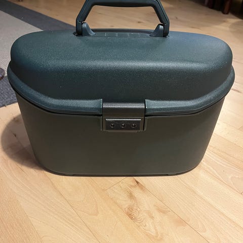 Samsonite grå hardcase beautyboks med orange streg og kodelås.
