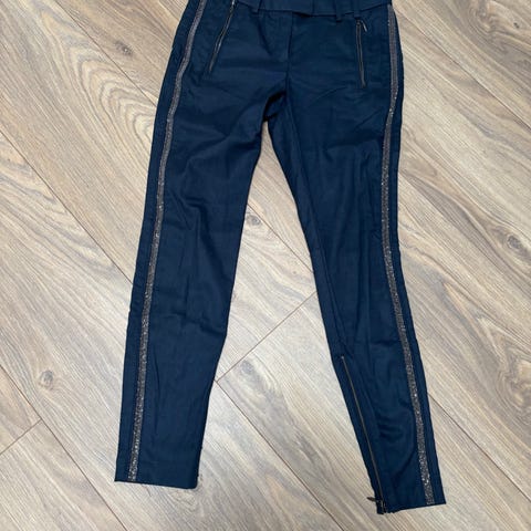 Bukserne har almindelig talje, lige ben og lukkes med knap foran. Baglommer bagpå. Stoffet har let stretch og er behageligt at have på.