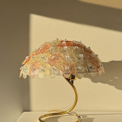 Dekorativ og raffineret Murano væglampe udført i samme petali-glasstykker, som denne smukke bordlampe fra samme glaskunstner, der også er til salg på profilen. Skærmene på lampen består af overlappende, håndformede glaselementer i varme, transparente nuancer, monteret på en indre metalstruktur med nittede detaljer.