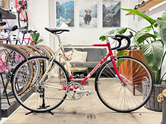 Flot gul lak med let patinering, komplet 2x8 geargruppe fra Campagnolo Avanti inkl. bremser og monteret med punkteringsresistente racerdæk. Resultatet? En stærk, driftssikker og ekstremt prangende makker – perfekt til pendling med personlighed.