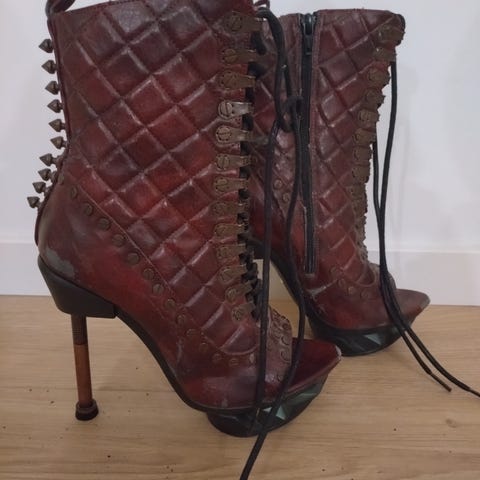 Amaranti korte italienske snørre læderstøvler med tegneserie motiv. Ca 10 cm hæl.