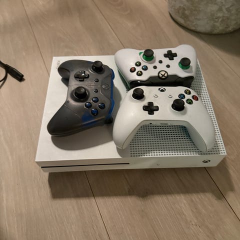Xbox Xbox One s spilkonsol i hvid farve med tilhørende controller. Konsollen bruges til at spille Xbox One spil. Medfølgende spil inkluderer FIFA 21, Call of Duty Advanced Warfare, og flere andre titler.