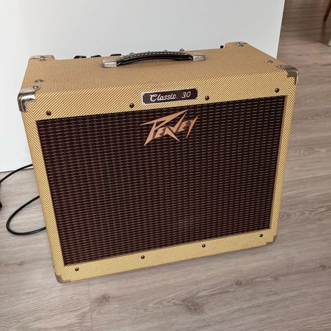 Peavey Classic 30 guitarforstærker med 30 watt effekt. Forstærkeren har et tweed-ydre og er håndlavet i USA. Den er udstyret med rør for varme og klar lyd, og indeholder en Peavey Black Marvel højttaler. Den kan hentes på Fyn