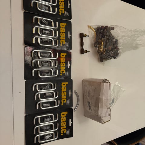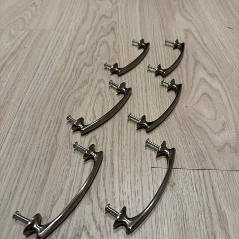 Robuste greb i jern i en buet form med flotte detaljer i enderne. Velegnet til montering på døre eller møbler. Købt i Sydfrankrig på loppemarked. Ca mål: 24 cm d: 10 cm b: 3 cm