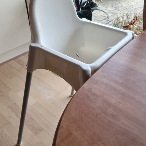 IKEA højstol til børn med hvid og beige polstring. Stolen har et stel i hvid og grå farve og er designet til små børn til brug ved spisebordet. Incl indsats