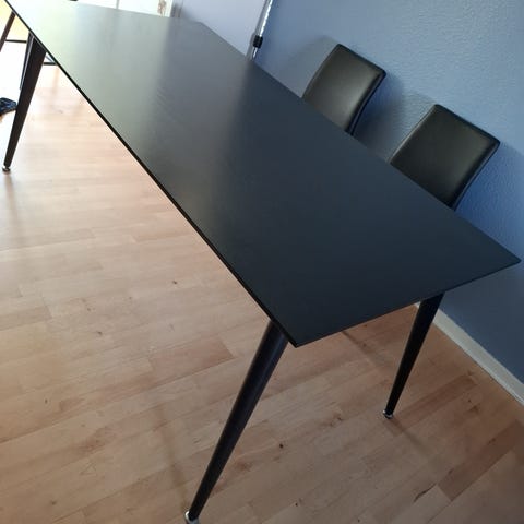 Venture Home Strada spisebord med tillægsplade i sort finértræ. Bordet er 120Øcm uden tillæspladen og 170cm i længden med tillægspladen. Købt for 6 måneder siden og helt nyt, uden nogen brugsspor. Der kan være 4 stole uden tillægsplade og 6-8 med tillægsplade. Nypris er 5999kr og kan hentes i København SV - byd endelig :)