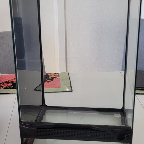 Reptil terrarium i glas med metalramme. Der følger lampe og hus med Terrariet. Velegnet til opdræt eller opbevaring af krybdyr.