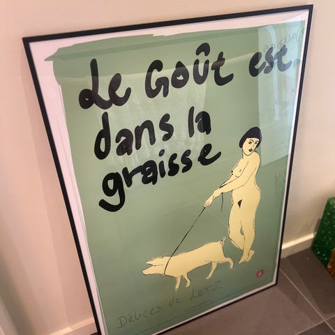 Babette plakat med illustration af en kvinde med et glas vin og et digt.