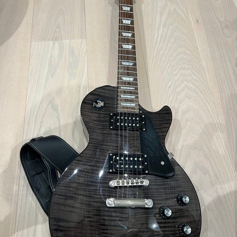 Epiphone Les Paul elektrisk guitar i sunburst farve. Guitaren har klassisk Les Paul design med to humbucker pickups, fire kontrolknapper og tremolo bro. Den er velegnet til forskellige musikgenrer og har et solidt trækrop og mahogni hals.