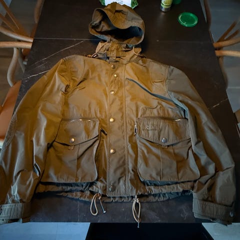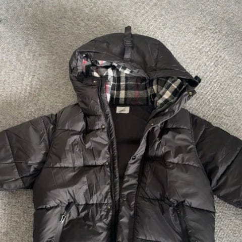 Burberry Jakke i størrelse XL til herre. Jakken er sort og fremstillet i polyester. Den har en hætte med Burberrys karakteristiske ternede mønster på indersiden. Jakken er designet til udendørs brug.