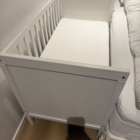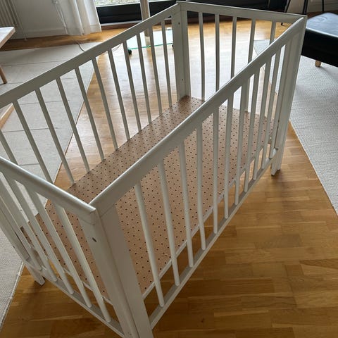 IKEA tremmeseng til børn i hvid. Sengen er udstyret med tremmer på alle sider og inkluderer en madras.