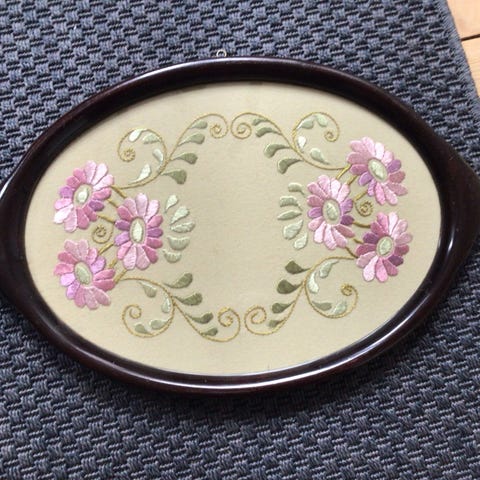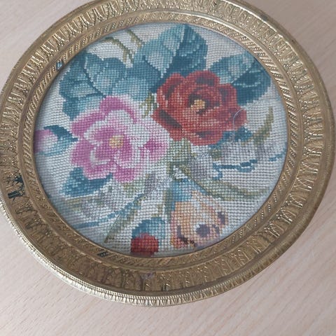 Bakke til ophæng, Gammel oval bakke med guld papirklip under glasplade.