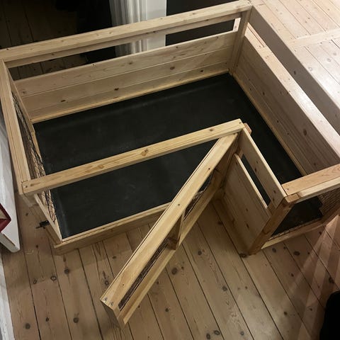 Løbegård / bur til marsvin / gnaver bestående af 12 elementer, som kan sammensættes efter behov. Måler ca 70 x 140 cm. Almindelige brugsspor, ex. lidt rust. Stofbund, som er slidt, medfølger - ikke vandtæt.