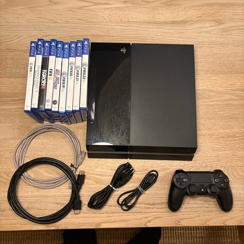 Sony Playstation 4 spillekonsol med tilhørende controller og 5 spil.