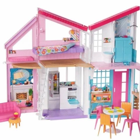 Barbie dukkehus legetøj i træ med flere etager og indvendige detaljer i pink og hvid. Dukkehuset har ruminddeling og møbleret interiør med forskellige mønstre og dekorationer. Der ses slid og mindre skader på overfladen, hvilket kan påvirke udseendet.