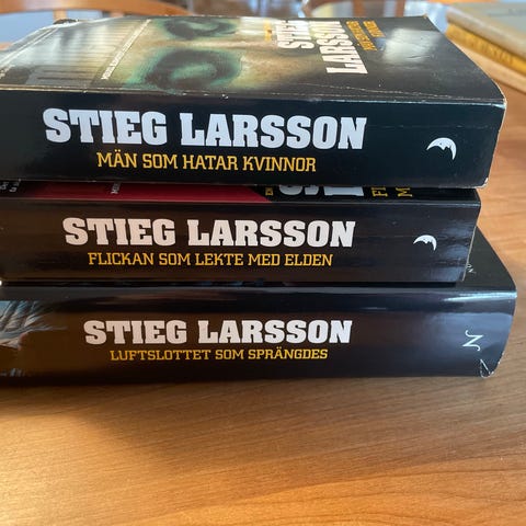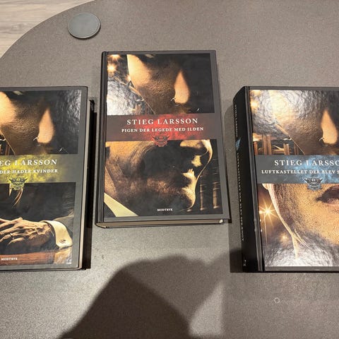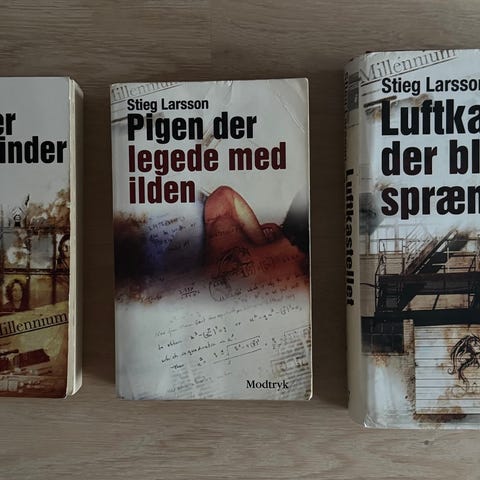 Stieg Larsson Millennium-serien bøger bestående af titlerne 'Mænd der hader kvinder', 'Luftkastellet der blev sprængt' og 'Pigen der legede med ilden'.